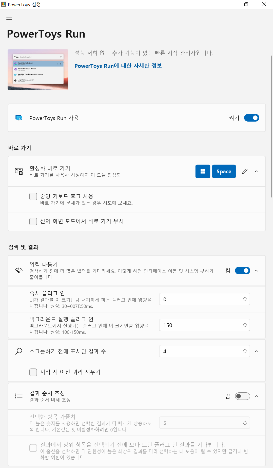 우선 가장 위에 있는 옵션인 PowerToys Run 사용을 활성화 시켜주어야 기능을 사용할 수 있으니 '켜기' 상태로 설정하면 되며, 바로 가기 단축키의 경우 다른 단축키들과 혼동이 있을 수 있으니 기본 설정된 상태인 win + space 키로 사용하는 것을 추천한다.