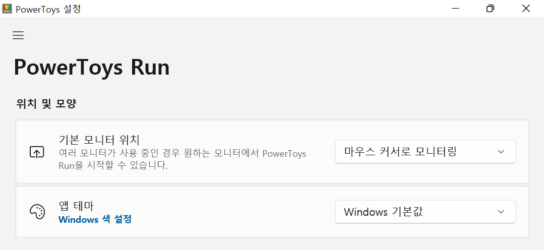 ■ 기본 모니터 위치 : 여러 모니터를 사용 중인 경우 어떤 모니터에서 PowerToys Run을 실행할 것인지 선택