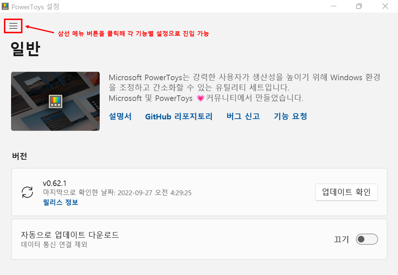 이후 실행된 PowerToys 설정 창에서 'PowerToys Run'을 선택해주면 되는데 PowerToys 설정 창의 좌측 상단에 위치한 삼선 메뉴를 클릭하여 진입 가능하다.