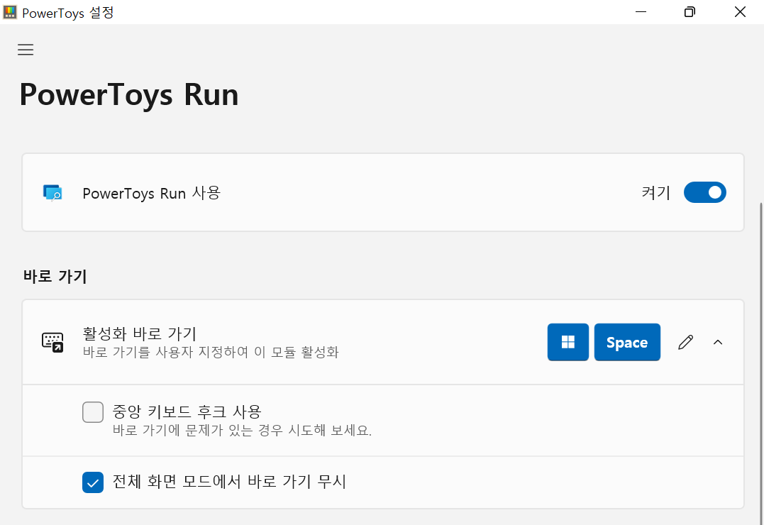 추가로 전체 화면 모드에서는 단축키를 입력해도 PowerToys Run이 실행되지 않는 것을 원한다면 바로 가기 설정 영역의 '전체 화면 모드에서 바로 가기 무시' 옵션을 체크해주면 된다.