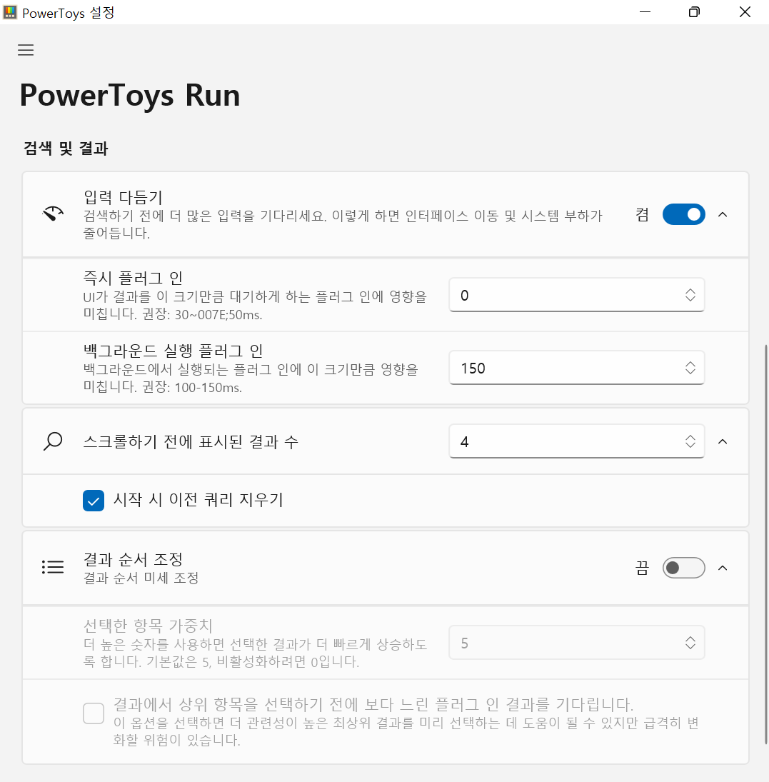 □ 시작 시 이전 쿼리 지우기 : 검색한 내용 실행 이후 PowerToys Run 재실행 시 이전 검색한 내용을 지울지 선택