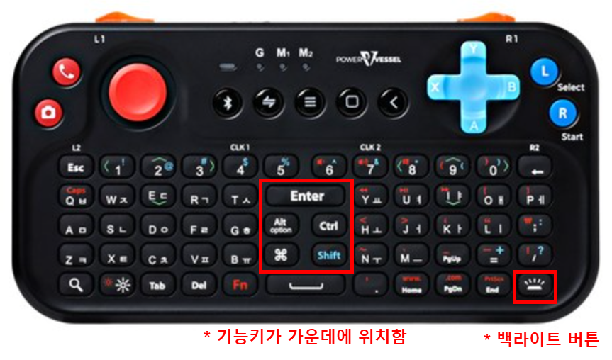 키보드 배열은 기능 키들(Enter, Alt, Ctrl, Shift 등)이 가운데 위치하여 일반적인 키보드와는 달라 사용할 때 적응이 좀 필요한 구조로 되어 있으며, 우측 하단의 버튼을 통해 백라이트 기능을 ON / OFF 할 수 있다.
