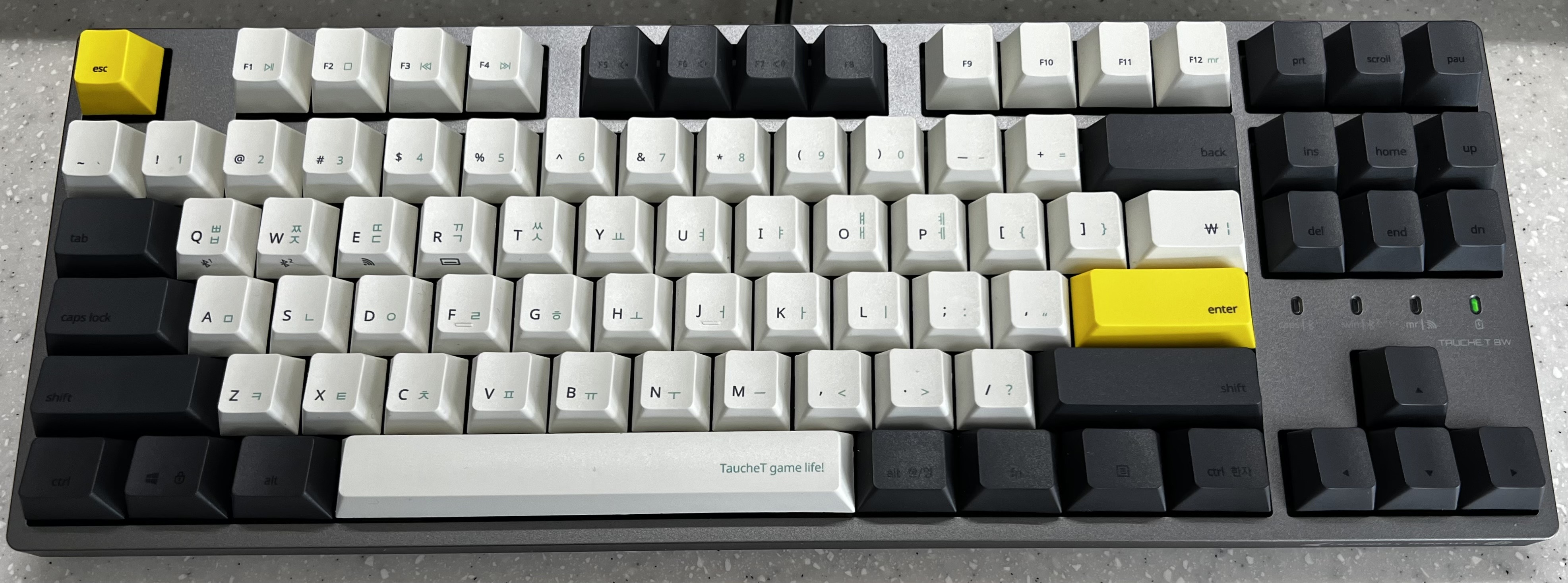 - 전체적인 투톤(그레이, 아이보리) 색상 조합과 esc, enter 포인트 키캡(옐로우)이 잘 어울림 (다크그레이 색상 기준)